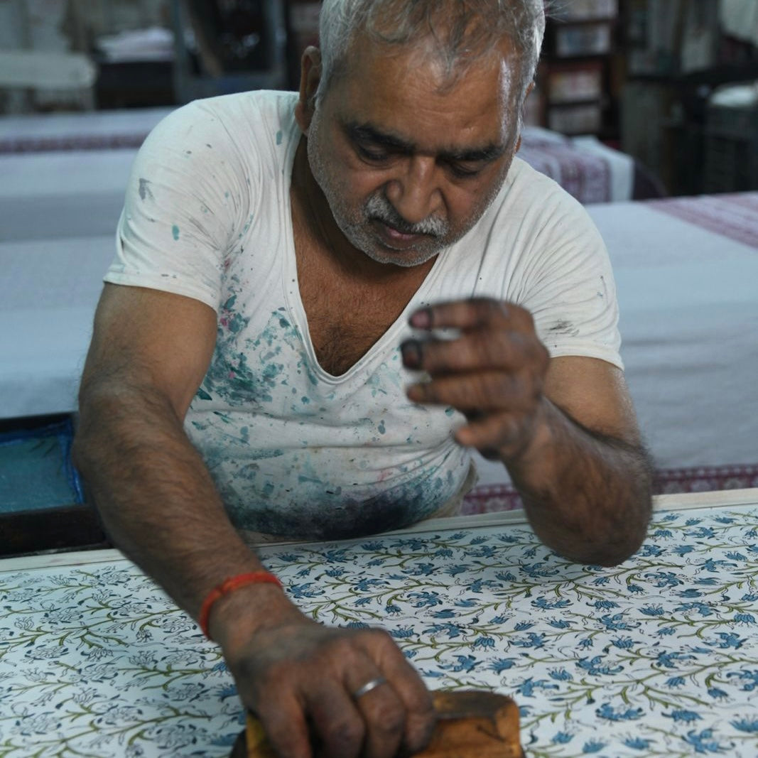 I'm Mohammed Mukeem, and I've been with Ratan's block printing department since 1980. When I started, we had a small team of 2-3 printers with just a few tables. Over these 45 years, the sense of family and growth here has been incredible. As the craft of hand block printing began to fade, I felt a deep responsibility to pass it on. My elder son, Imran, joined us in 2004, followed by my younger son, Rizwan, in 2012. Now, all three of us work together at Ratan, keeping this beautiful tradition alive. Sharing this journey with my sons is a source of great pride and joy.