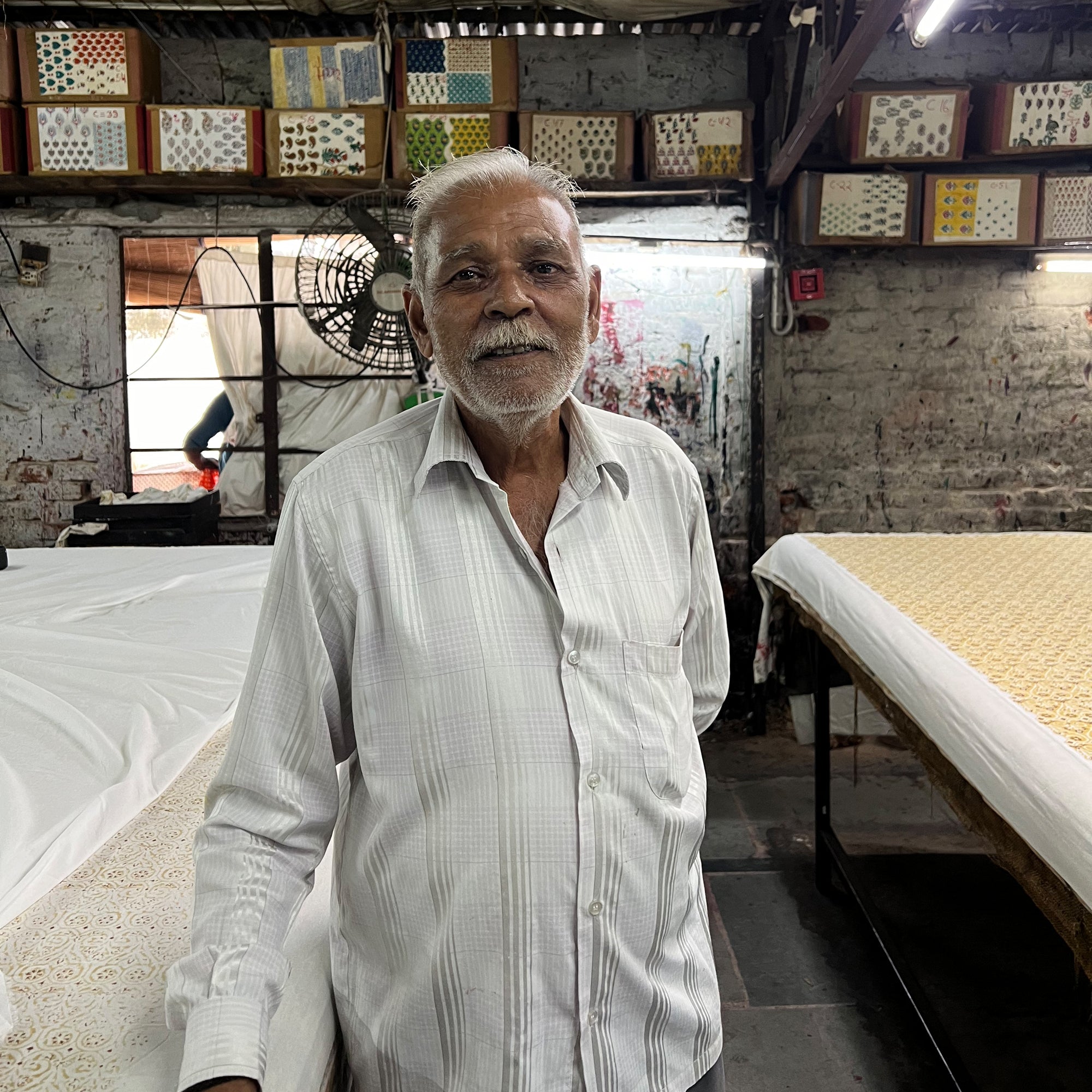 I'm Anand Bihari, and my journey with block printing has been an adventure. Before I joined Ratan in 1989, I spent years freelancing as a block printer. For the past 35 years, I've been part of a team dedicated to preserving and celebrating this beautiful craft. Each day is a new opportunity to create something unique. Ratan is not just a workplace; it's a place where my passion for printing has truly flourished.