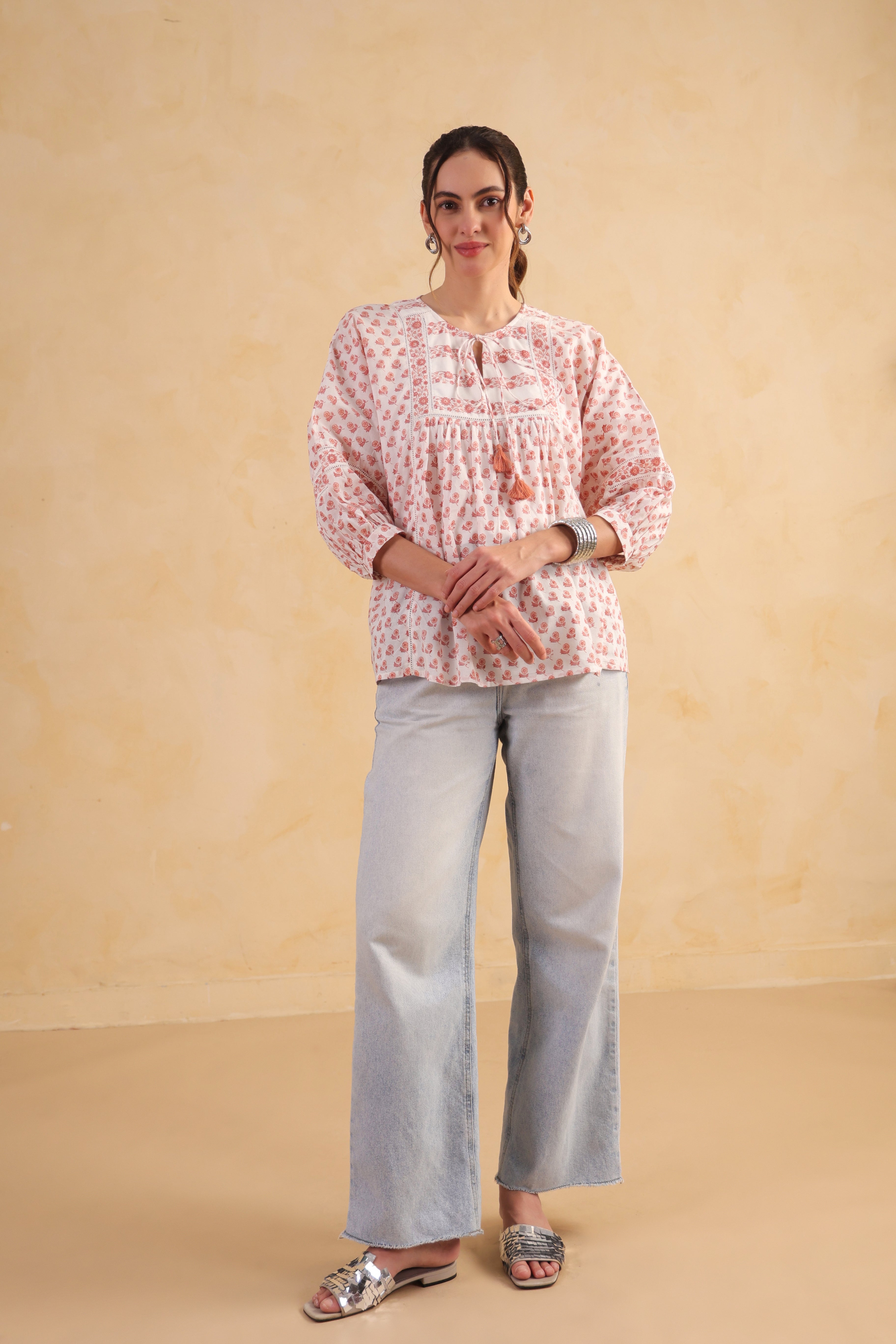 Add a soft, feminine touch to your everyday wardrobe with this batwing gathered top from Ratan Jaipur. Crafted from lightweight voile fabric, it features delicate peach motifs on a white base with gentle gathers that create a relaxed and flattering silhouette. The airy batwing sleeves ensure all-day comfort, making this top perfect for casual outings, summer days, and effortless everyday styling.