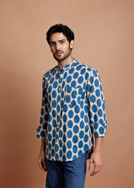 Embark on an urban chic trip with our men's full-sleeve shirt. It radiates elegant design, dressed in a tranquil cream/blue hue and embellished with a birch pattern. This hip-length shirt, made of soft cotton, seamlessly combines comfort and modern flare. Upgrade your wardrobe with this contemporary masterpiece that embodies everlasting sophistication.
