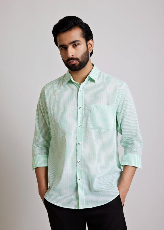 Relish the pin-striped emerald sophisticated symphony with our finely constructed block-printed shirt. Crisp cotton is used to render the deep green with white specks, perfectly combining comfort and style. The delicate pinstripes provide an image of subtle elegance while the long sleeves can be rolled up for a confident look.