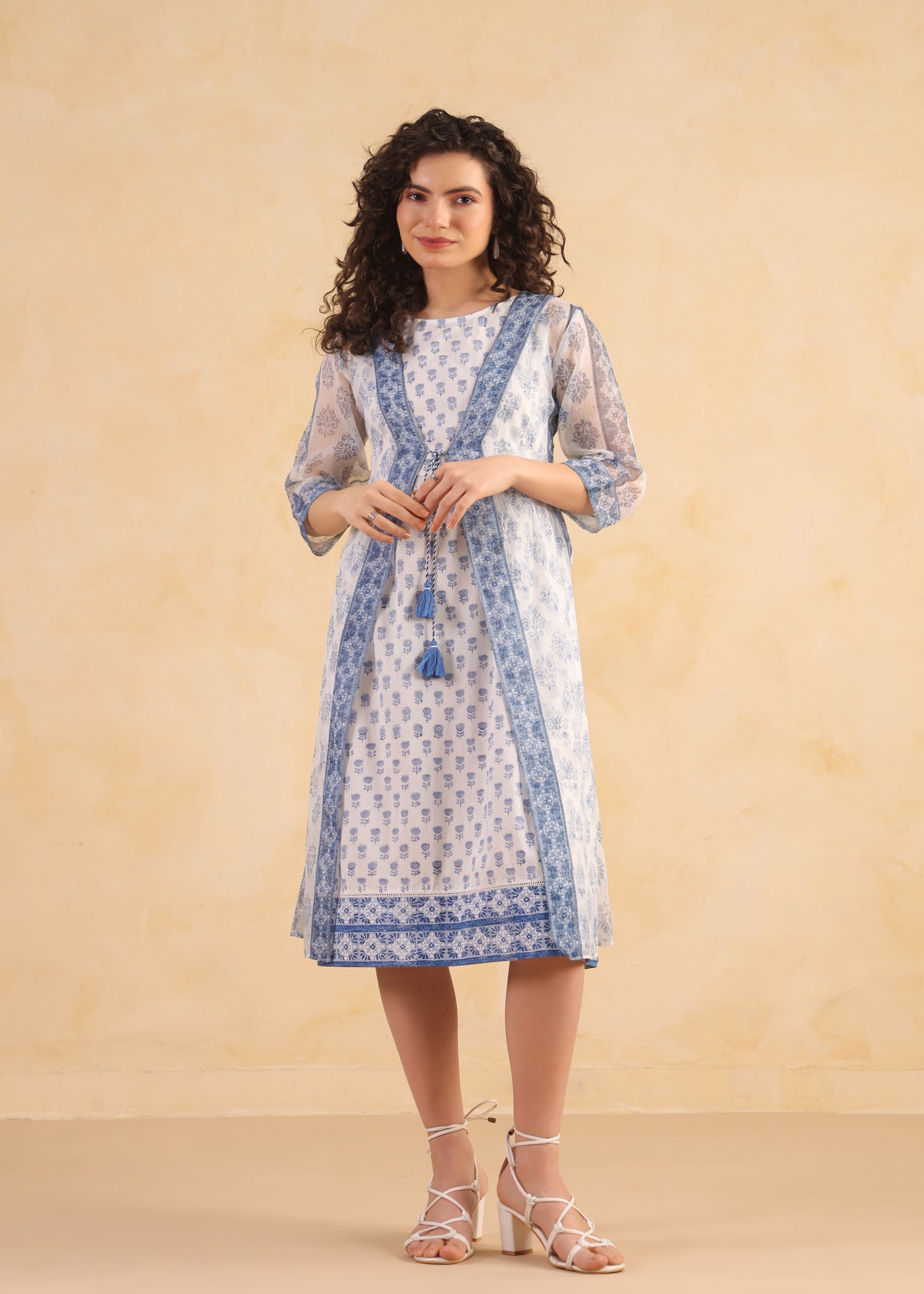Refresh your summer wardrobe with the Ratan Jaipur Kota Doria Shrug Dress in Blue/White. This elegant layered outfit features a sheer Kota Doria shrug paired with a soft cotton inner dress for breathable comfort. The delicate floral-inspired print and decorative tassel tie add a handcrafted charm, while the three-quarter sleeves create a graceful silhouette. Lightweight and airy, this outfit is perfect for warm-weather styling and effortless everyday elegance.
