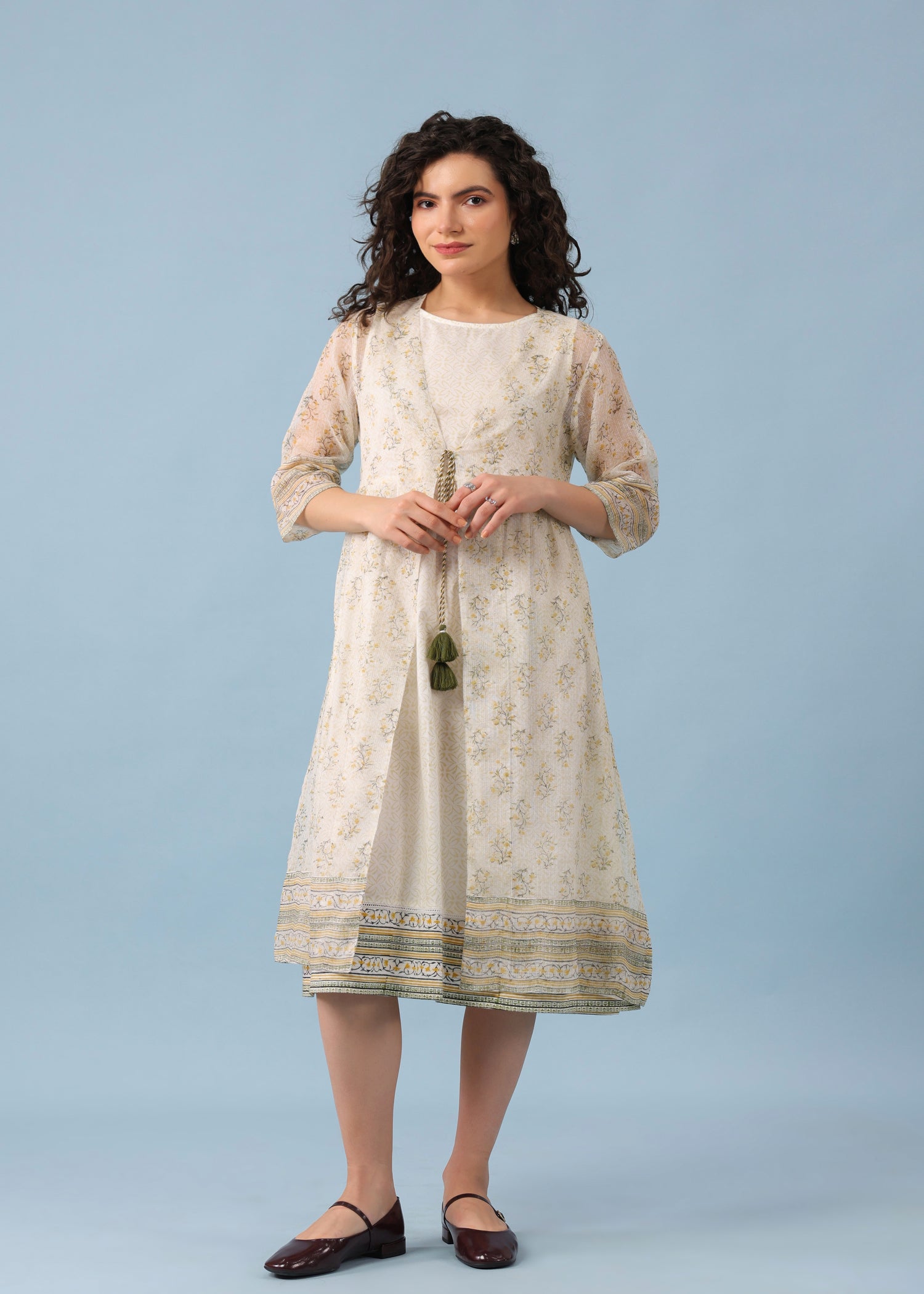 Elevate your summer wardrobe with the Ratan Jaipur Kota Doria Shrug Dress in Green/White. Crafted from airy Kota Doria fabric, this elegant layered outfit features a sheer printed shrug paired with a soft cotton inner dress for breathable comfort. The handcrafted tassel tie and delicate patchwork-inspired print add a traditional touch, while the three-quarter sleeves and lightweight silhouette make it perfect for warm-weather styling. A graceful blend of heritage craft and modern design.