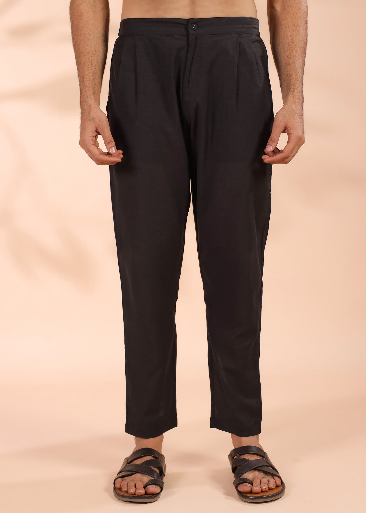 These Men's black viscose straight-fit pants from Ratan Jaipur offer a sleek, versatile, and modern look suitable for both casual and semi-formal occasions. The soft, breathable viscose fabric ensures exceptional comfort, while the clean and structured silhouette pairs effortlessly with kurtas, shirts, and printed styles. Ideal for daily wear, festive events, or polished ethnic outfits, these black viscose pants bring a refined and timeless appeal to your wardrobe