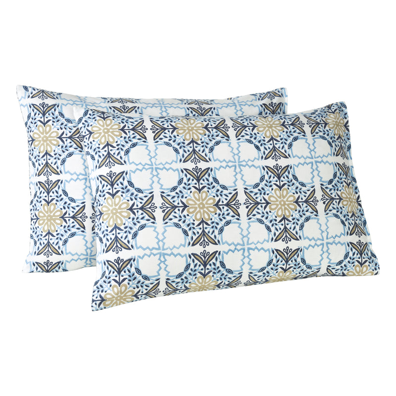 The Mirakee pillow cover in soft blue and beige is crafted from smooth cotton sheeting, offering comfort and elegance. Its subtle geometry and soothing tones make it a versatile addition to any serene bedding setup.