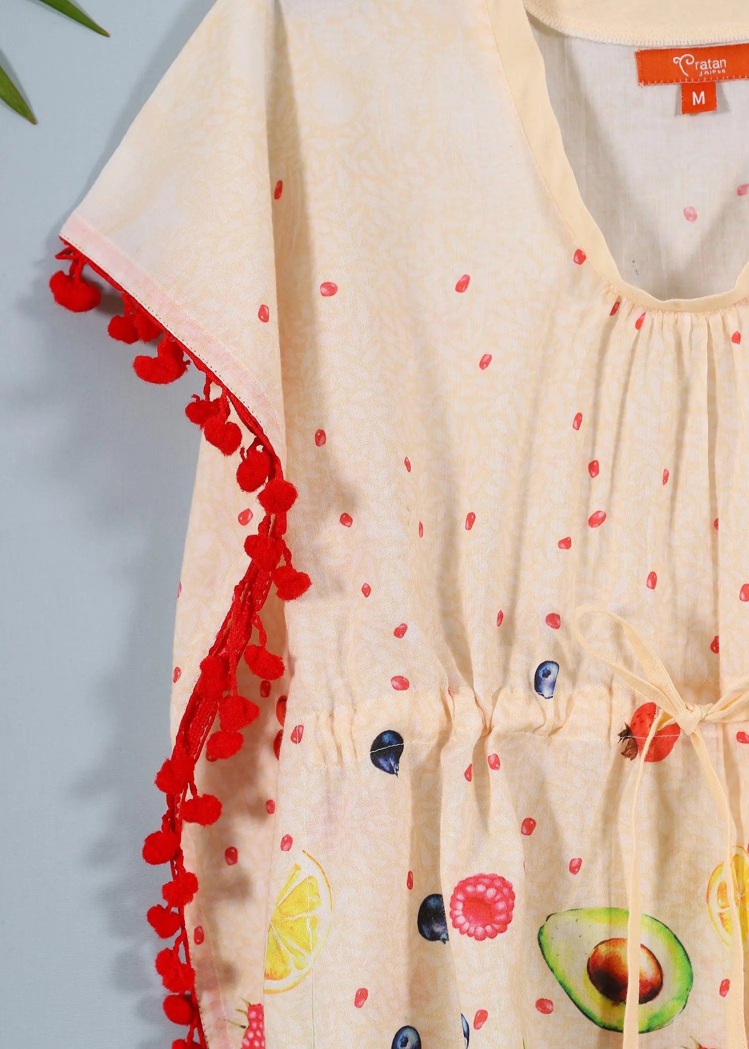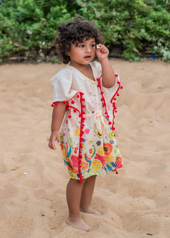 Say hello to this cute kaftan and brighten up the vacation dressing for your little girls. The vibrant and playful pick tailored in mal cotton makes it cloudy soft and breathable. Accents like contrast pompom laces and drawstring at the waist for the desired fit make them the perfect resort wear for your little girl. Pick from our summery prints and grab the same print merchandise for twinning with your beloved family.