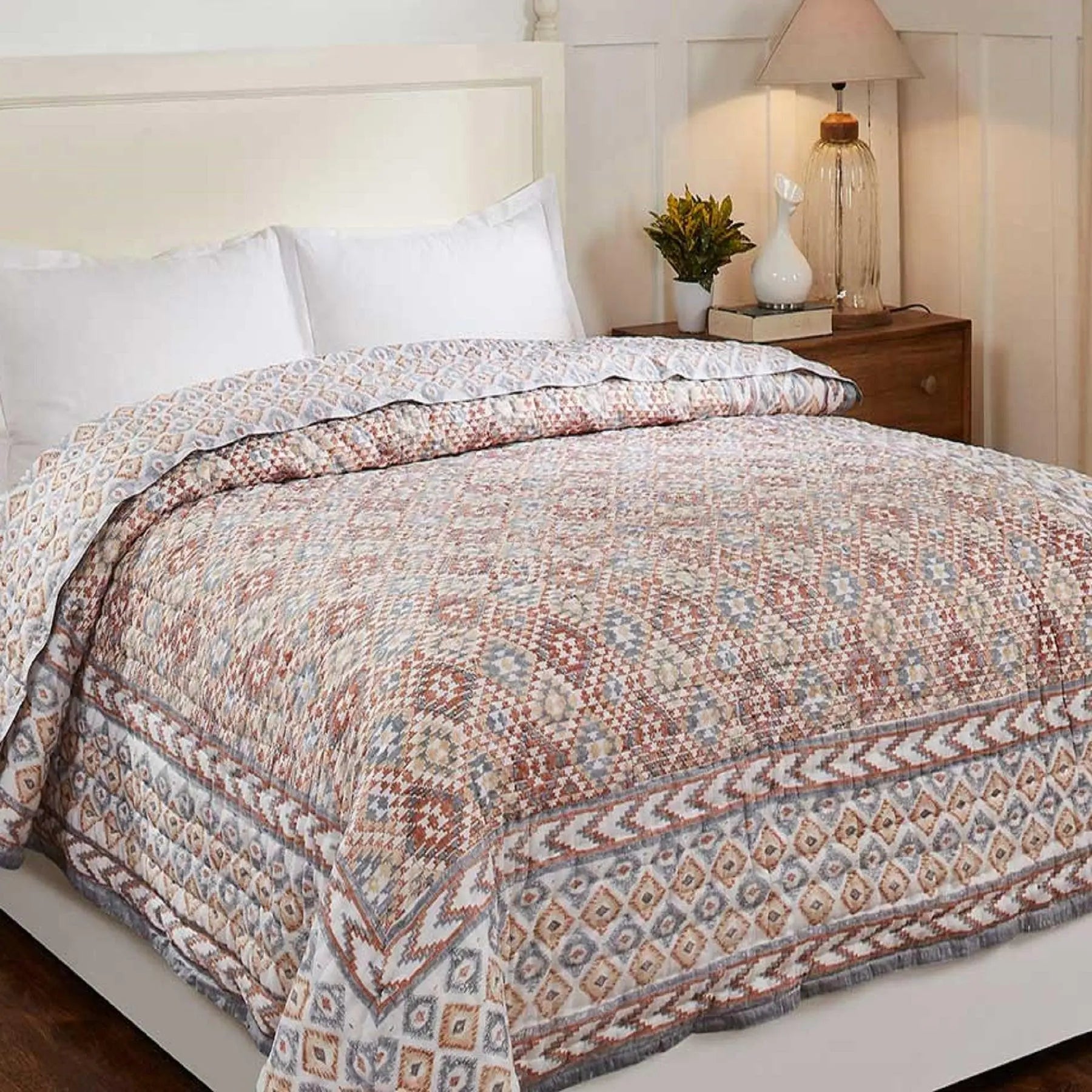 Printed reversible quilt popularly known as AC quilt is printed in house with wood carved blocks by our skilled artisans through the age-old process of block printing. This ancient printing technique utilizes a hand-carved teak wood block that is dipped in dye and stamped by hand onto fabric. The operation has to be repeated several times if working with multiple colours.