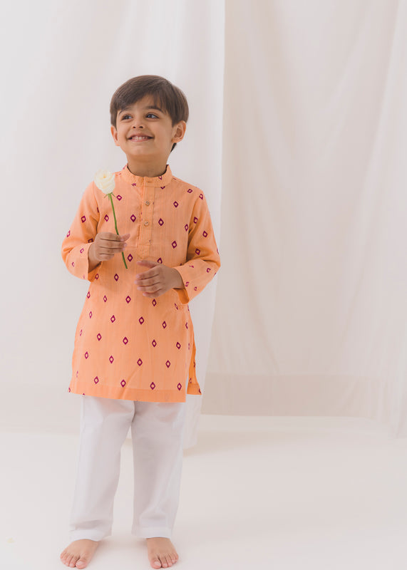 Festive and playful, this printed cotton kurta for boys is designed for all-day comfort while keeping the traditional charm alive. Perfect for small celebrations, family get-togethers, or festive occasions.