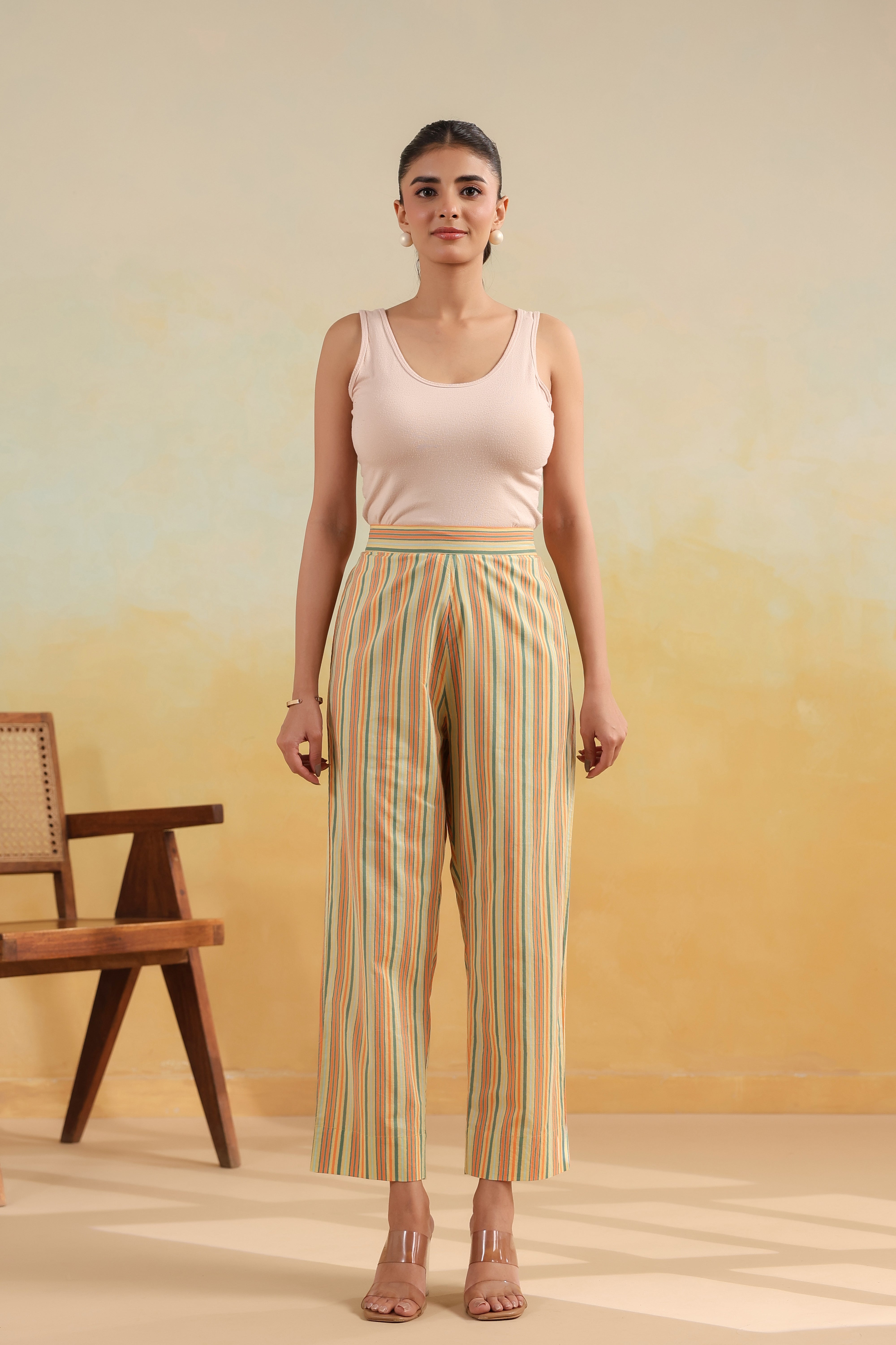 This yellow, tapered Prithvi pant for women is made from soft cotton fabric that feels light and breathable. Featuring a stylish striped design and tapered silhouette, it is ideal for daily wear, office wear, or casual styling. Comfortable yet versatile, this pant pairs effortlessly with printed or solid kurtas. A perfect everyday essential for women who love relaxed fits with subtle colour.
